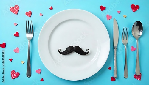Father's Day concept. Flat lay top view of plate, cutlery, knife, fork, black mustache and hearts on blue background with space for text or promotion and greeting message, created with generative ai