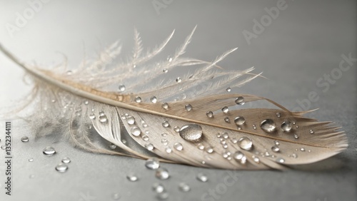 Feather with water droplets, delicate and tranquil, resting on a smooth surface with soft light background