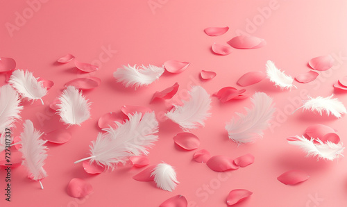 feathers and rose petals on a pink background