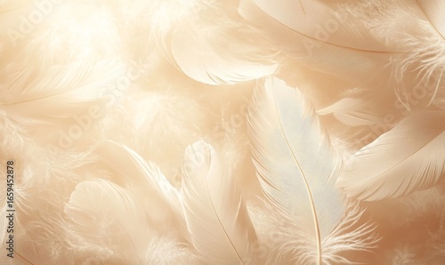 Feathers background with a beige color blend, creating an aesthetic soft style with natural elements and a gentle touch. The design emphasizes purity, beauty, and tranquility, Generative AI