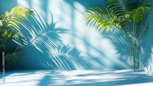 Features a minimalist, generative concept with palm leaves casting shadows on a blue wall and pastel floor, summer tropical beach background, empty room ideal for product. 8k High Resolution