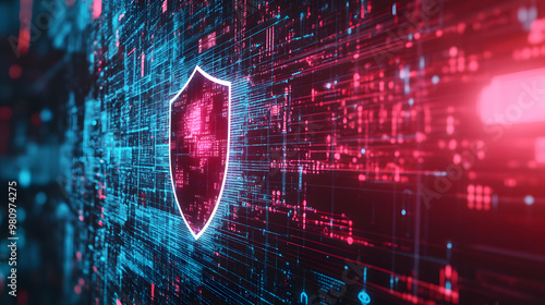 featuring a digital padlock icon, with binary code cascading around it. A digital shield and firewall symbols dominate the cybersecurity .Android robot navigating through a cyber digital world.