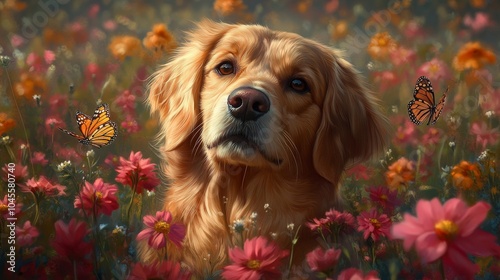 Featuring pets in vibrant, garden settings, emphasizing joyful and lively moments. Ideal for garden-themed social media posts and pet blogs. Detailed view of pets among flowers.