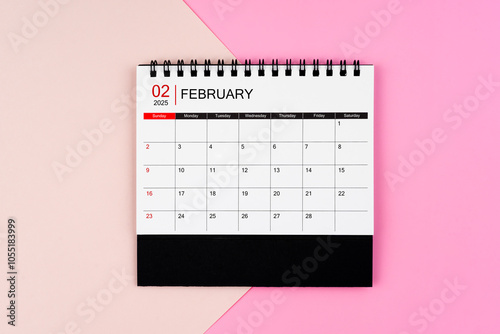 February 2025 desk calendar on pink background. Page of annual monthly calendar for your plan.