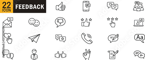 Feedback editable outline icon set. Review, rating, comment, approval, communication and more.