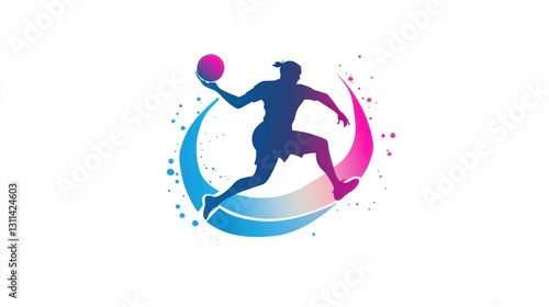 Female athlete jumping with ball; dynamic action; abstract background; for sports, fitness, or design use