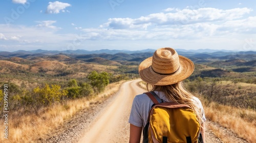 Female backpacker exploring scenic dirt road in rural landscape. Ideal for solo travel, outdoor adventure, and personal discovery themes.