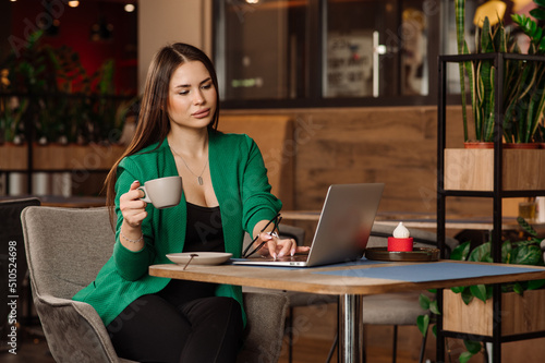Female blogger or freelancer drinking coffee and working with a laptop in the cafe or coworking area
