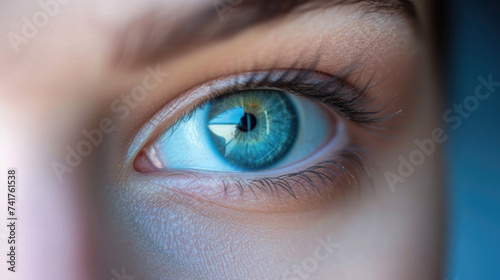 female blue eye, eyelashes, texture on the iris and pupil, vision correction, close-up