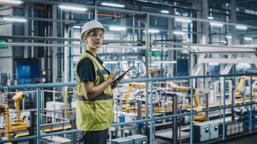 Female Car Factory Engineer in High Visibility Vest Using Laptop Computer. Automotive Industrial Manufacturing Facility Working on Vehicle Production with Robotic Arms. Automated Assembly Plant.