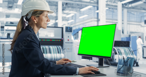 Female Caucasian Software Developer Working on a Desktop Computer with Green Screen Chromakey On Display At an Industrial Plant. Technological Research and Development Office Monitoring the Production