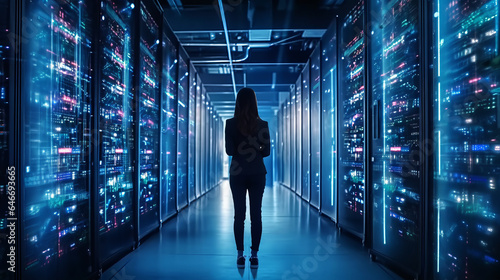 Female Chief Technology Officer Using Laptop Standing In Warehouse, Activates Servers.generative ai