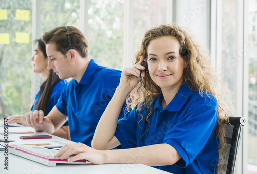 Female customer support operator at work. Team Business and Delivery call center in office. Working with a headset in blue uniform.
