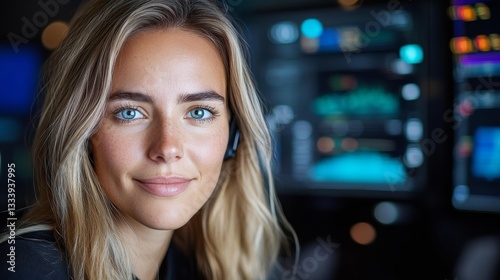 Female cybersecurity expert with headphones in a high-tech control room. Generative AI
