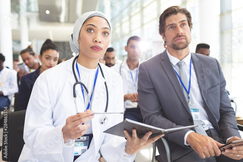 Female doctor with businessman attending seminar