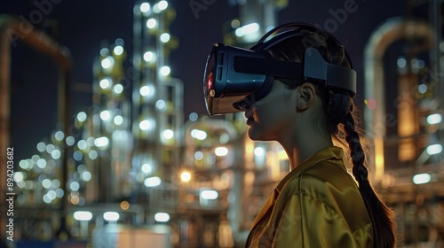 Female Engineer Wearing Virtual Reality Glasses in Oil industrial plant at night