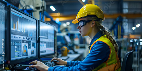 Female factory worker monitoring production on computer" / "Engineer using dual monitors in industrial control room