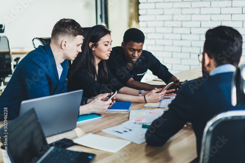 Female finance expert holding smartphone and reading business publication about news in proud ceo world via content website while connected to free company wifi during break from work with partners
