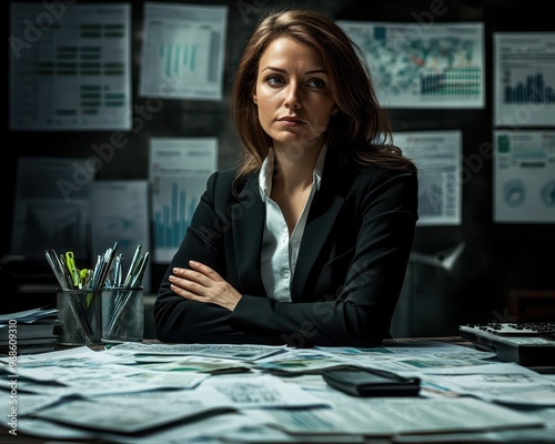 Female government advisor surrounded by deficit spending charts and economic models, consulting on national budget policies
