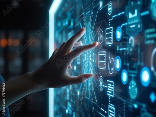 female hand touching smart device with computer icons
