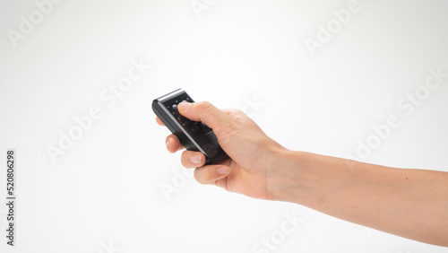 Female hand with remote control pointed upwards on a white background
