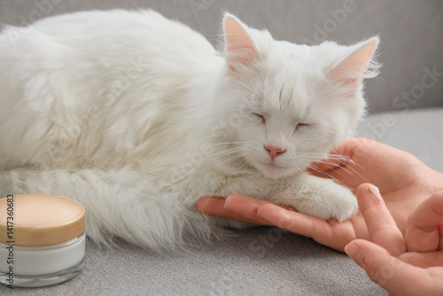 Female hands applying cream onto cat's paw at home, closeup