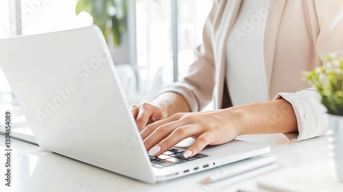 Female hands are typing on laptop keyboard in modern office with plants, working productively on computer