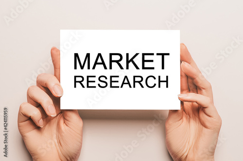 Female hands hold card paper with text Market Research on a yellow background. Business and finance concept