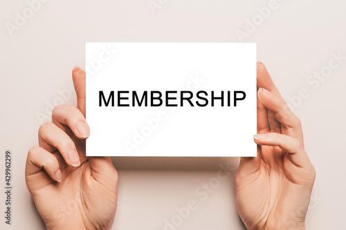 Female hands hold card paper with text Membership on a yellow background. Business and finance concept