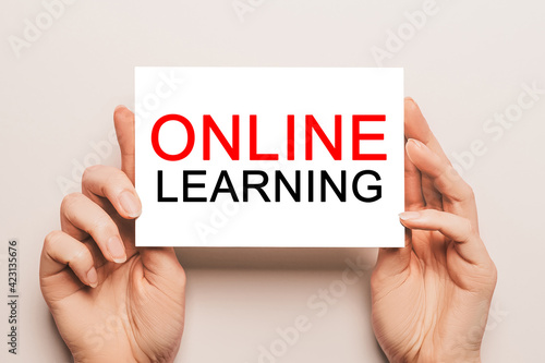 Female hands hold card paper with text online learning on a yellow background. Education and study concept