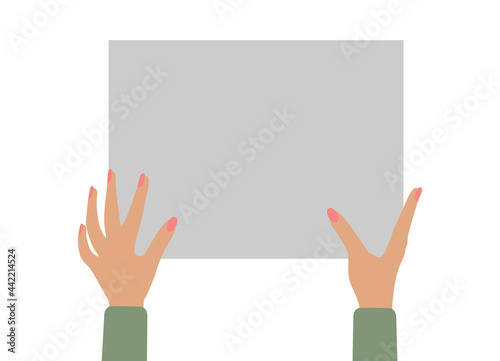 female hands holding empty banner, copy space for text. Vector illustration