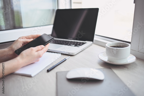 Female hands using smart phone in interior workplace, freelance business woman using cell phone at office desk, working from home using smart phone and notebook computer. Remote worker quarantine