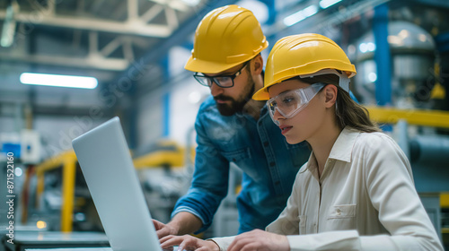 Female industrial engineer and man in yellow helmet working together on laptop at factory, concept of technical engineering
