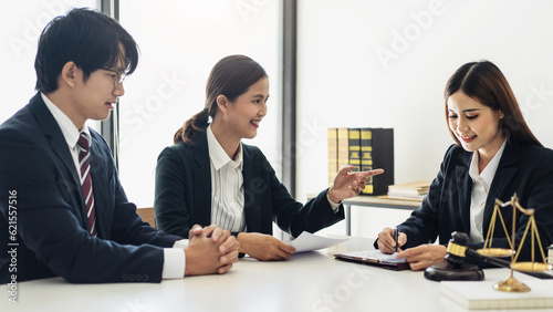 Female lawyer is reading business document and giving advice about laws and agreements of contract with