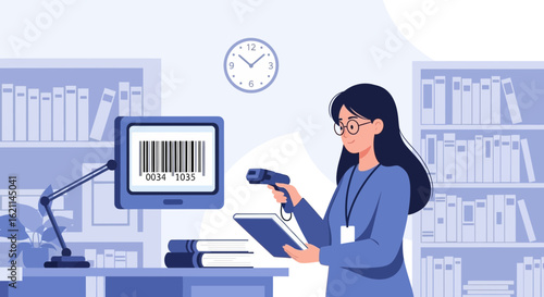 Female Librarian Scanning Barcode Bookshelf Knowledge Organization Technology Learning