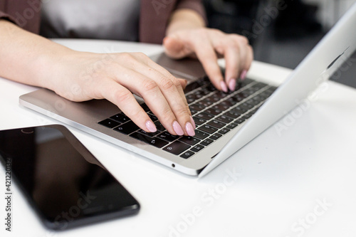 Female office worker typing on the keyboard,working at home office hand on keyboard close up. High quality photo