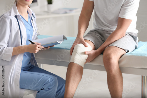 Female orthopedist examining patient with injured knee in clinic, closeup