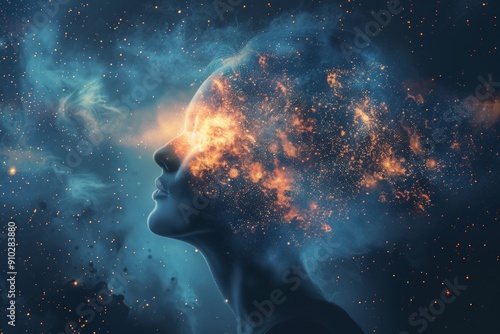 Female portrait blended with abstract colors and magic mind on the subject of joy of life and imagination