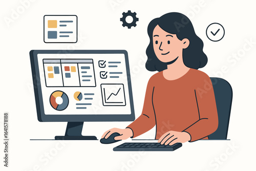 Female project manager at desk multitasking on computer, managing business projects, analyzing data charts, tracking team workflow, productivity dashboard, modern office, flat vector illustration
