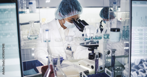Female science team working on biohazardous samples. Using microscope and computer with data