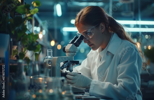 Female scientist conducting research in a laboratory while examining samples under a high-powered microscope