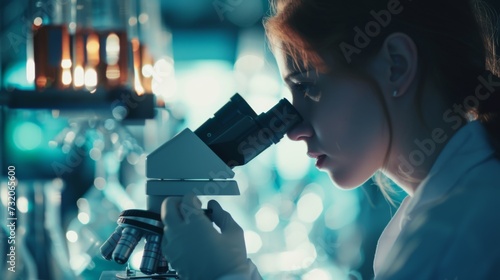 Female Scientist Engaged in Microscopic Research