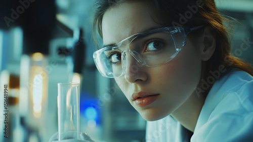 Female scientist examining a test tube with a concentrated expression, sterile laboratory background