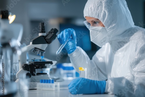 Female scientist in a protective suit working with a test tube and microscope at a laboratory