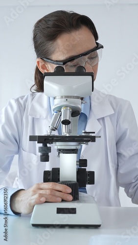Female scientist wearing lab coat and protective glasses using microscope, analyzing samples in test tubes in modern laboratory, conducting scientific research