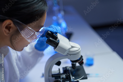 Female scientist wearing lab coat and safety glasses using microscope doing scientific research in modern laboratory, developing new treatment