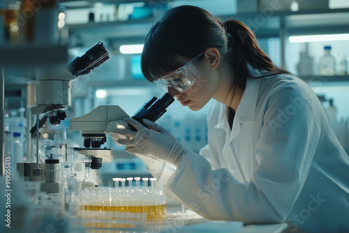 Female scientist working in laboratory. Young female scientist using microscope while working in the laboratory