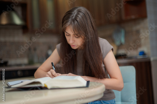 Female student learning and preparing exam at home. Woman reading textbook and taking notes