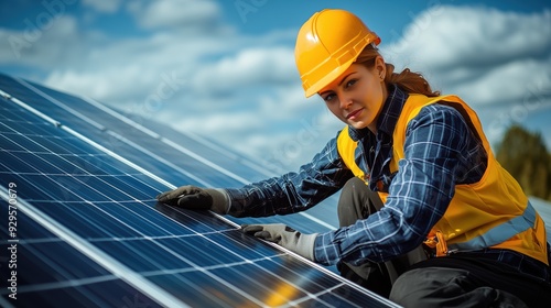 Female technician installing solar panels on roof. Female technician in a yellow hard hat and reflective vest installs solar panels on a roof, ensuring proper alignment and functionality.