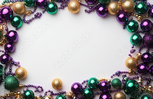 Festive Arrangement of Colorful Christmas Ornaments in Green, Purple, and Gold Surrounding a Blank Space for Holiday-Themed Backgrounds and Decorations